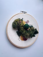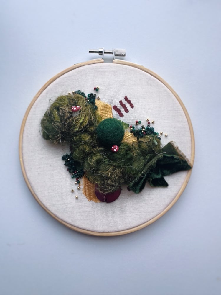 ā½ Mixed media embroidery hoop - abstract landscape featuring mossy roving, velvet, tiny mushrooms, scattered beadwork, and golden accents