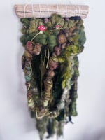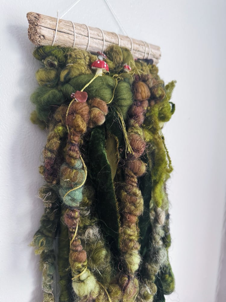 ā½ Woven wall hanging on natural driftwood - cascading roving in forest green, olive, moss, and brown with velvet ribbon, curly locks, and tiny mushroom details throughout