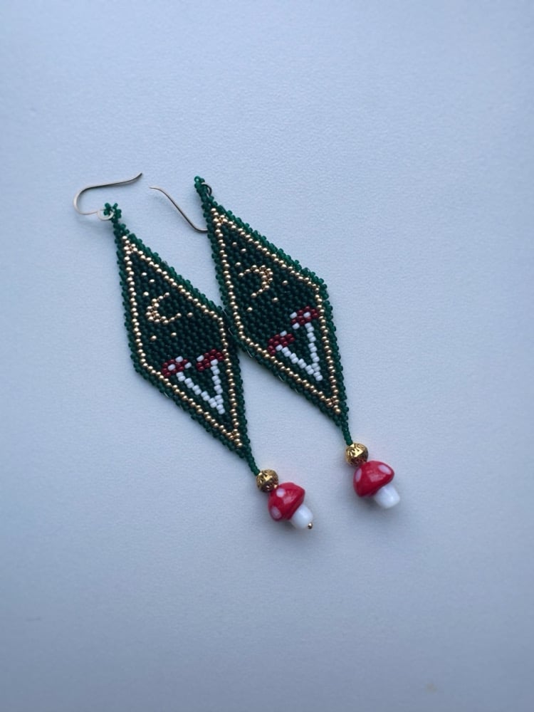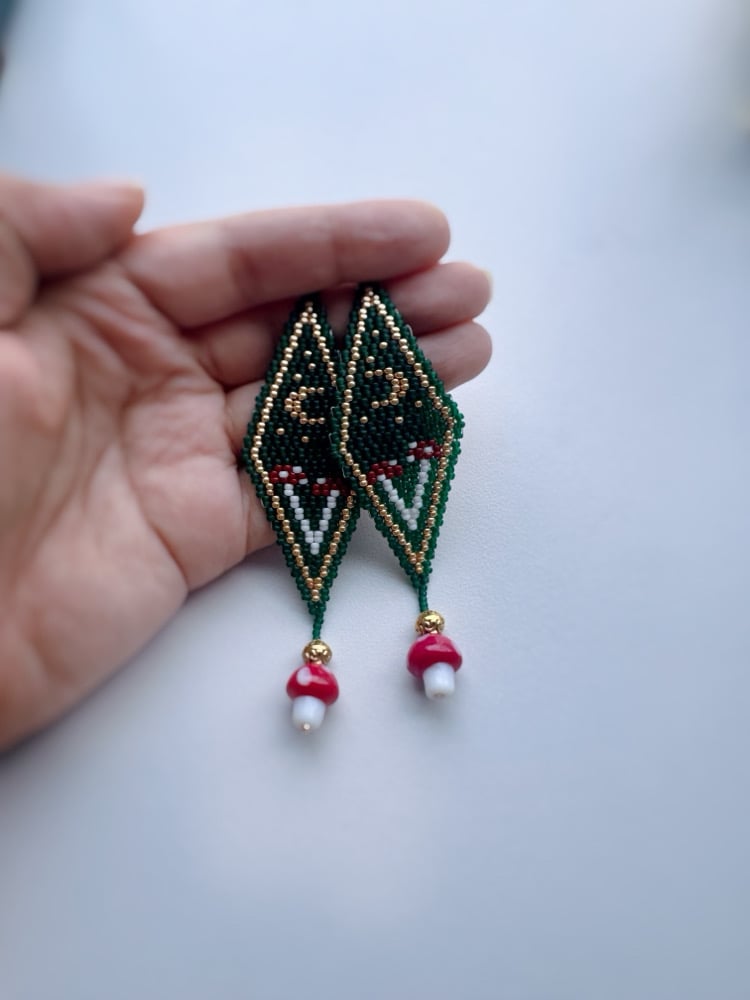 ā½ Handmade beaded earrings - forest scene diamond design in dark green with gold border, featuring tiny beaded mushrooms and a red mushroom charm drop on hypoallergenic niobium hooks