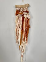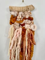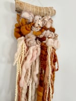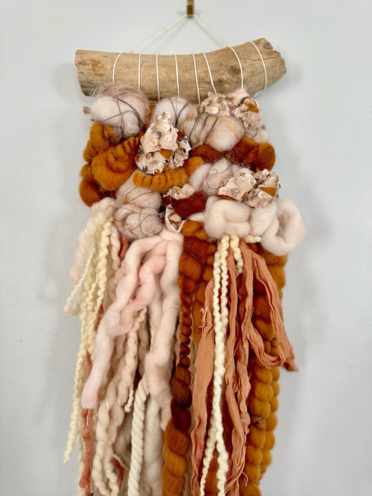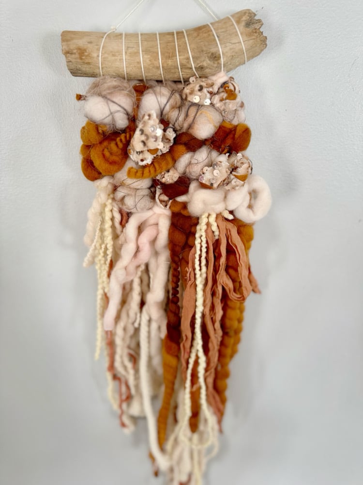 Terra Cascade is a sculptural wall hanging featuring hand-dyed wool roving in warm amber, rust, and blush tones, accented with sequin-adorned fiber clusters.
