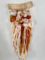 Suspended from a piece of natural driftwood, the piece cascades into flowing fringe of varied textures—chunky wool braids, soft roving twists, and strips of terracotta-hued fabric.