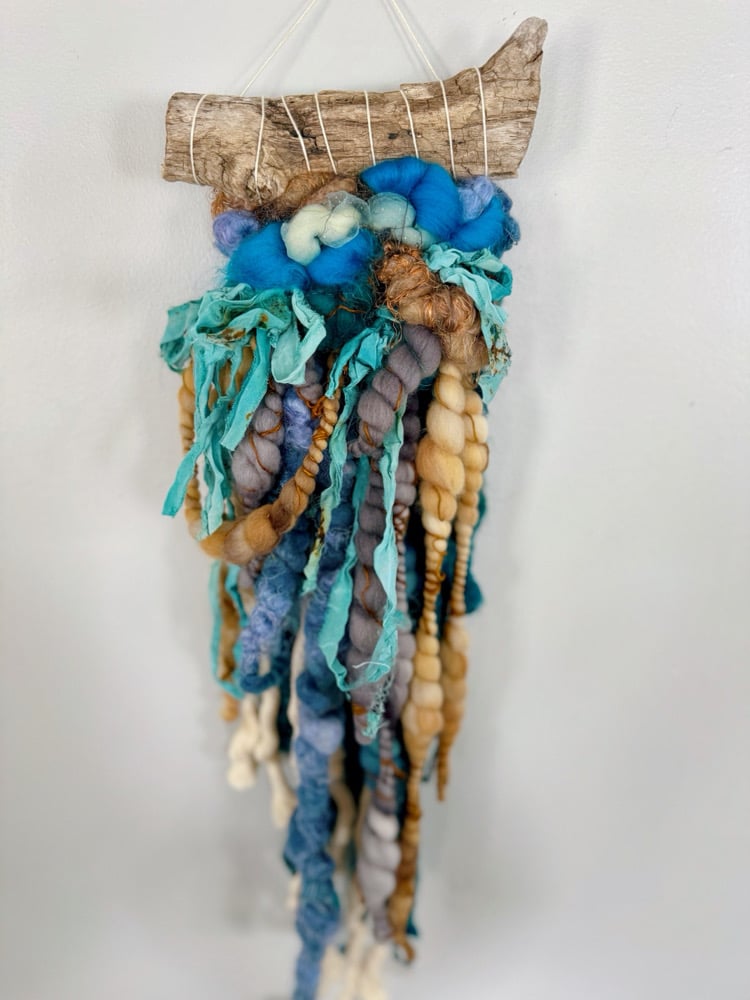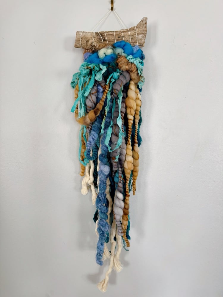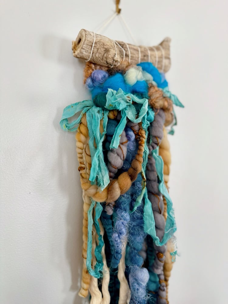 Tideline is a sculptural wall hanging inspired by the colors of the coast. Hand-dyed wool roving in ocean blue, seafoam, lavender-grey, and sandy gold cascades from a piece of natural driftwood, accented with flowing strips of turquoise sari silk ribbon.